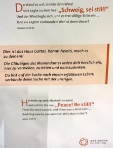 Ab und an führt mich mein Weg auch in den schönen Hildesheimer Mariendom. Am Eingang begrüßt ein kleines Schild die Besucherin/den Besucher in diesem Gotteshaus. Und dort findet sich, sehr zu meiner anfänglichen Überraschung, die Sturmstillung abgedruckt (beim einen Eingang; gegenüber ist ein Text aus 1 Kön 19 zu finden).