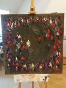 Hinter uns liegt ein eng getakteter und inhaltlich dichter Vormittag – da haben wir uns die Pause redlich verdient. Prof. Theißen hat pointiert den Römerbrief als „Theologie in Bildern“ erschlossen – ein Zugang, der den oft sperrigen Text ein wenig zugänglicher macht. Anschließend wurden in Gruppenarbeiten Bilder von Gott oder Bilder vom Menschen mithilfe ausgewählter Texte aus dem Römerbrief vertieft oder die grundsätzliche Frage nach der Macht der Bilder diskutiert. Und passend dazu hat die Malerin Natalia Rudolf das Gehörte und Bedachte in einem Bild festgehalten – als künstlerische Resonanz.